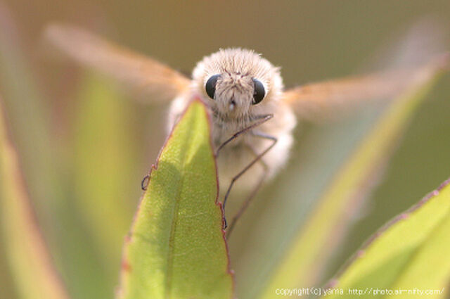 猫顔の幼虫ヒメジャノメ 90 Papillon 蝶の写真を撮っています